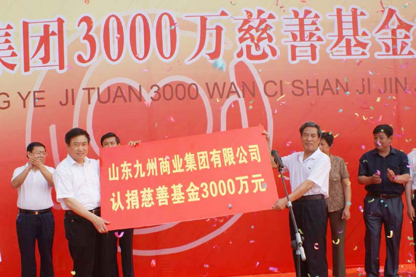 此次認(rèn)捐3000萬元慈善基金,是集團在去年向市慈善總會認(rèn)捐200萬元,設(shè)立“九州慈善基金”的基礎(chǔ)上追加的。隨著追加額度的增加,救助范圍也逐步的擴大,從去年的用于助學(xué)擴大到走訪困難群眾和其它全市慈善救助項目。多年來,集團在自身不斷發(fā)展壯大的同時,牢記報效國家、回饋社會、投身公益的使命,積極參與各類助學(xué)、助殘、救災(zāi)、濟困等公益活動。集團累計捐款捐物達數(shù)百萬元,尤其去年四川大地震后,集團全體干部職工心系災(zāi)區(qū),捐款捐物100余萬元,受到社會各界的一致好評。今年59日集團被評為臨沂市首屆“十大慈善單位”。九州人用大愛譜寫了一曲曲獻身慈善事業(yè)的壯美樂章。