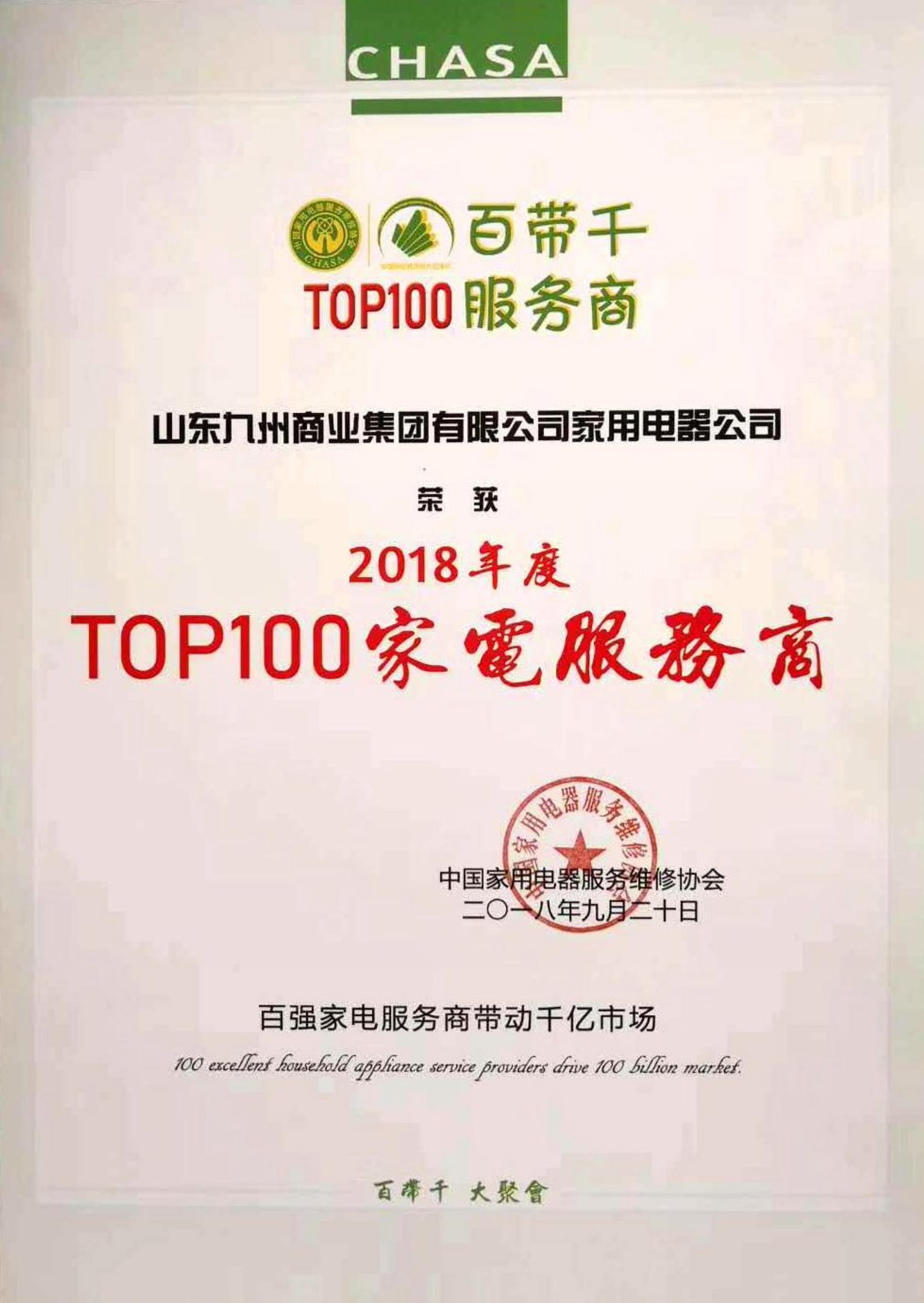 九州家電喜獲全國“TOP100家電服務(wù)商”榮譽稱號