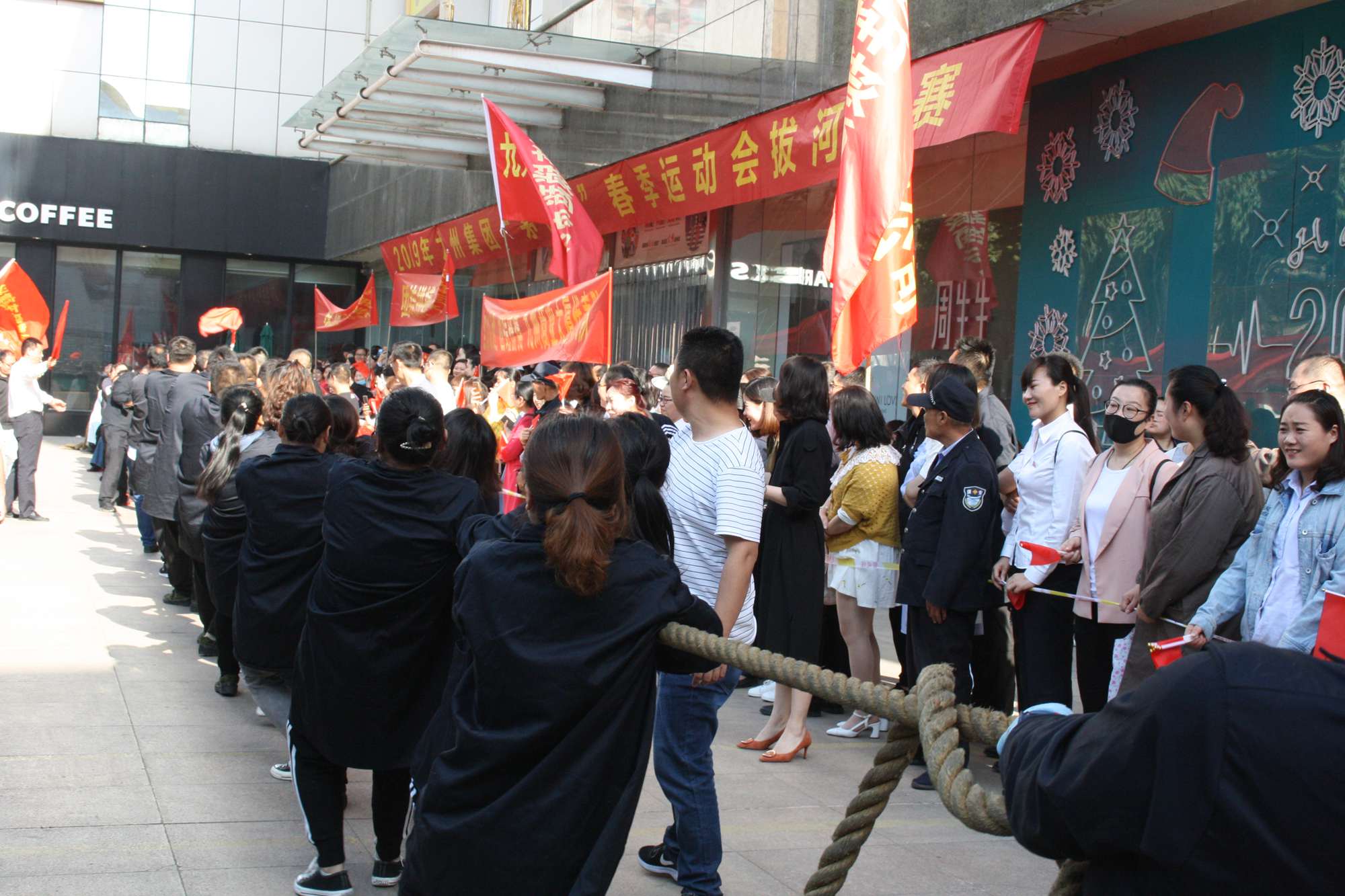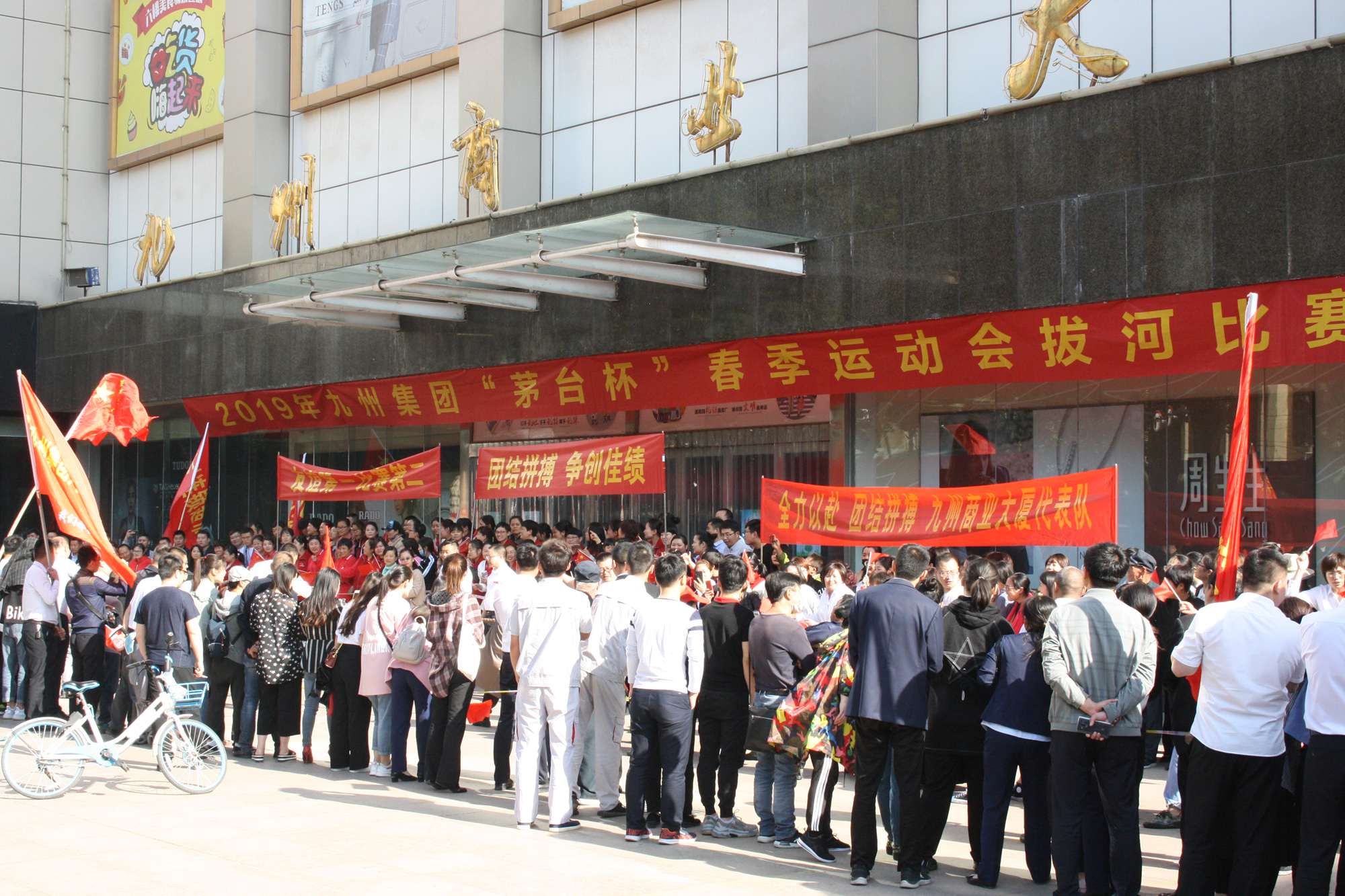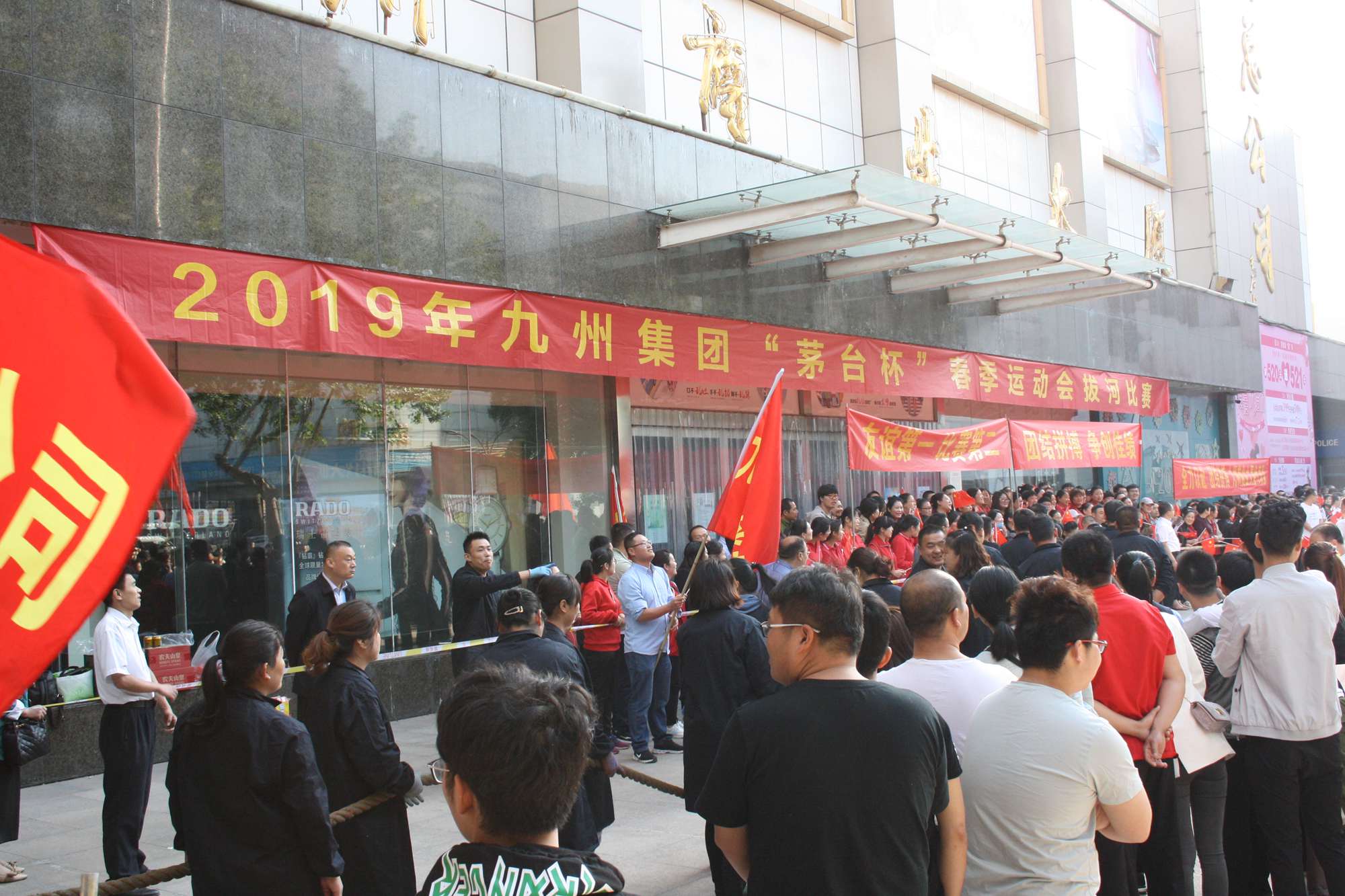 5月21日上午,九州集團2019年運動會拔河比賽項目在九州大廈解放路店門前廣場舉行。來自各經營單位和集團行政的六支代表隊參加了比賽。