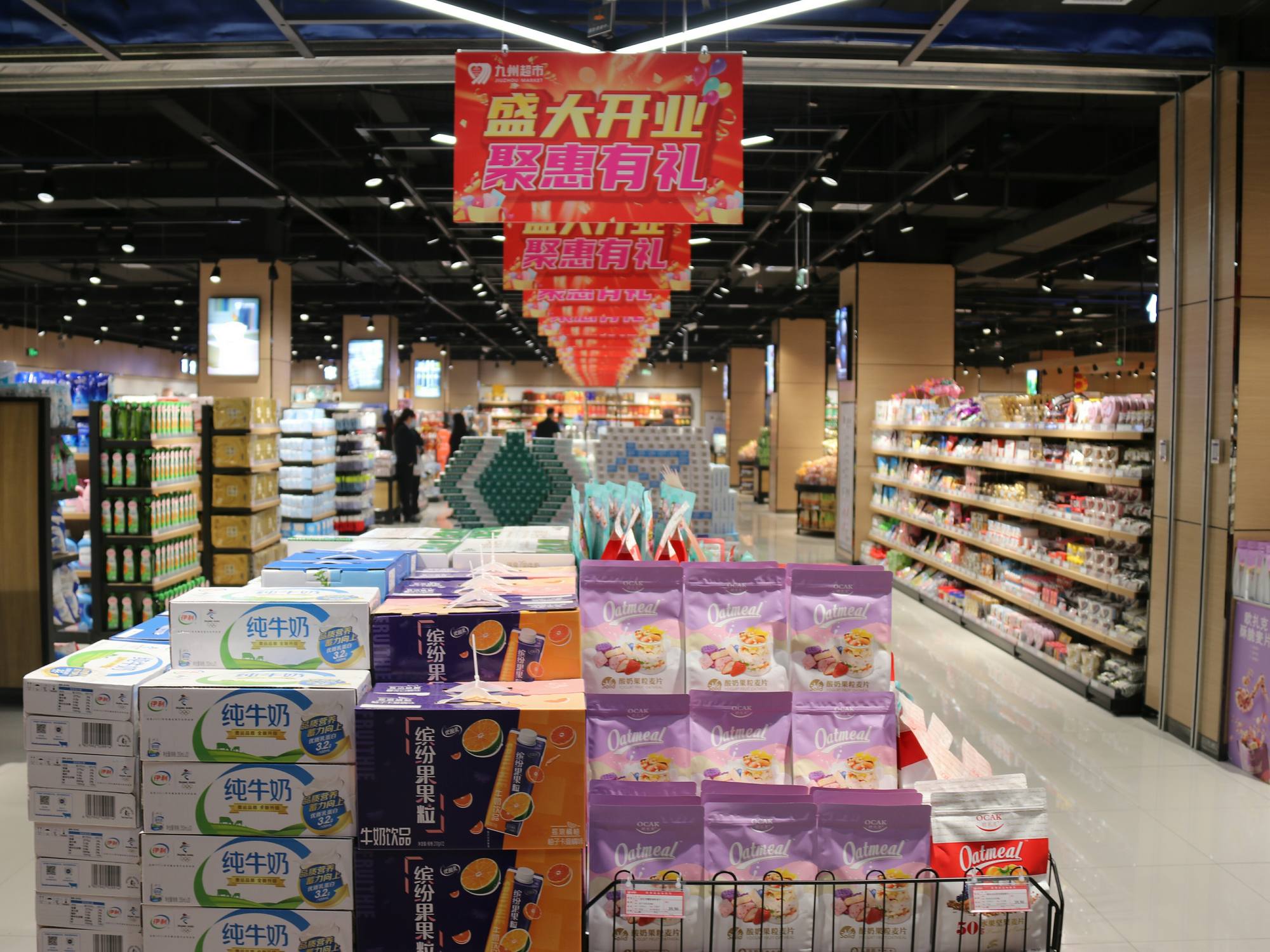 九州超市解放路店位于九州家電解放路店負(fù)一樓,經(jīng)營面積3600多平方米,經(jīng)營品類涉及煙酒、休閑食品、生鮮果蔬、鮮肉水產(chǎn)、乳品飲料、日化百貨等。在開業(yè)籌備期間,公司各部門上下齊心,各司其職,各項(xiàng)工作穩(wěn)步推進(jìn),保障了門店順利開業(yè)。