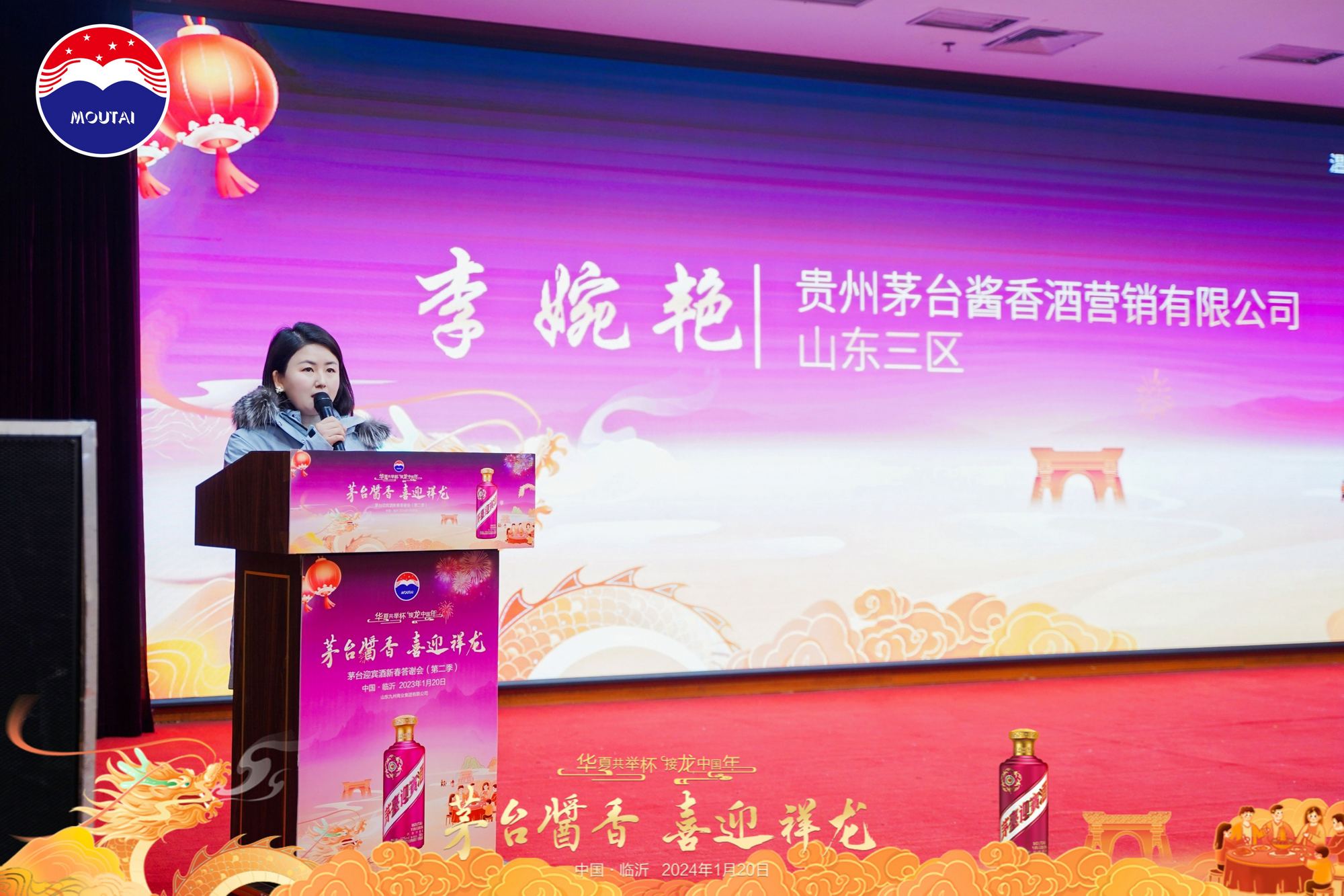答謝會現(xiàn)場布置精美絕倫,洋溢著新年的喜悅氛圍,營造出了“互動體驗+文化賦能+情感交流”的場景;精彩紛呈的節(jié)目表演,帶領現(xiàn)場嘉賓零距離感受茅臺迎賓酒(紫)濃厚的待客文化。貴州茅臺醬香酒營銷有限公司山東三區(qū)臨沂地區(qū)負責人李婉艷在致辭中表示,茅臺迎賓酒(紫)是茅臺迎賓酒品質(zhì)和品牌再升級的經(jīng)典核心之作,其口感層次更加豐富,包裝更加精美。茅臺迎賓酒(紫)也是茅臺醬香系列酒中帶“茅臺字樣”的三款產(chǎn)品之一,具有標志性和重要意義。超市公司副總經(jīng)理兼煙酒采購部經(jīng)理張峰在致辭中表示,茅臺迎賓酒(紫)擁有先天的迎賓系列市場優(yōu)勢,在醬香酒市場上有著強大的市場競爭力。它用紫氣東來的美好寓意,迎天下之友,意在“禮”、意在“迎”,為人們營造一種“座上客常滿”的祥和生活氛圍。