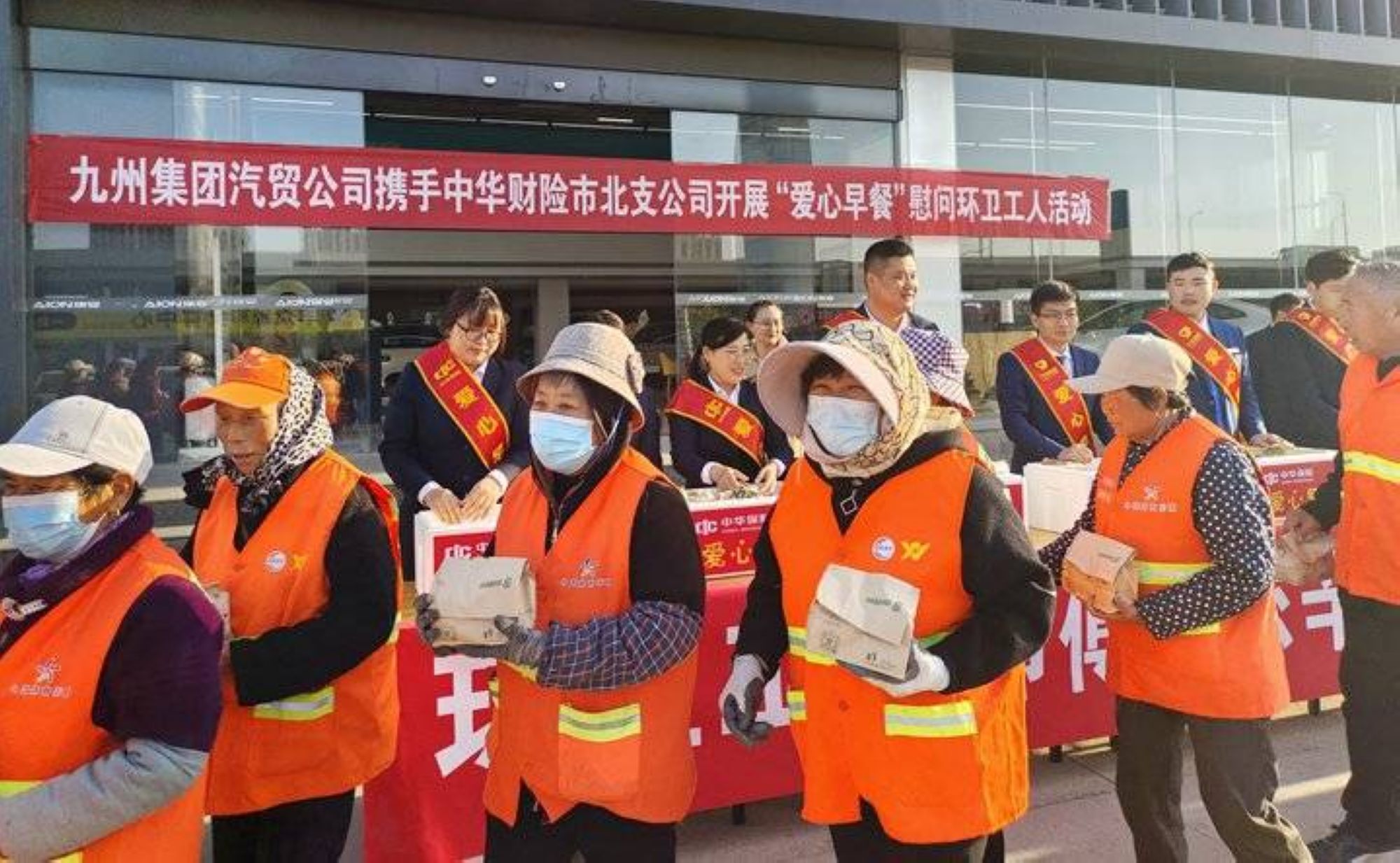 4月15日早上,九州汽貿(mào)攜手中華財(cái)險(xiǎn)市北支公司在九州埃安4S店門前廣場(chǎng)開(kāi)展了“愛(ài)心早餐”慰問(wèn)環(huán)衛(wèi)工人活動(dòng),為“喚醒城市的美容師”送上了春日清晨的第一份溫暖。