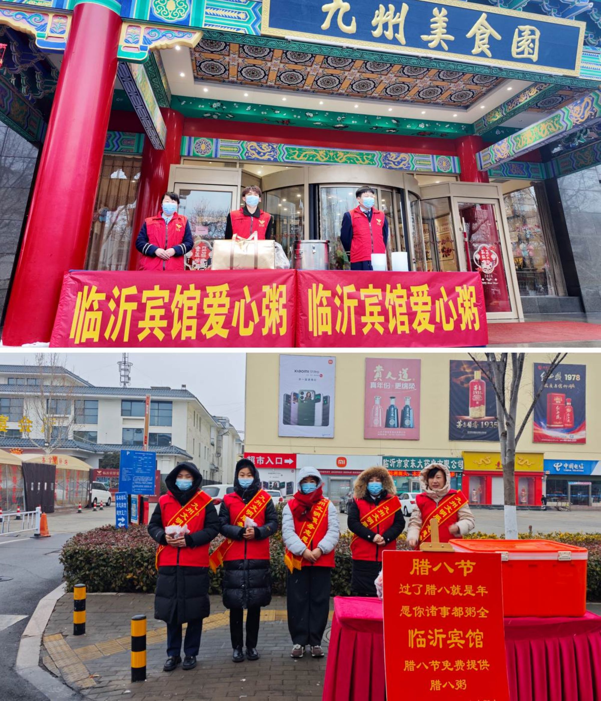 九州商業(yè)大廈解放路店門前廣場(chǎng)上一派熱鬧景象,在蘭山區(qū)綜合行政執(zhí)法局的指導(dǎo)下,九州商業(yè)大廈聯(lián)合惠民早餐、瑯琊篆刻書畫院開展“一碗臘八粥•一副暖心聯(lián)•情暖街區(qū)”公益活動(dòng)。