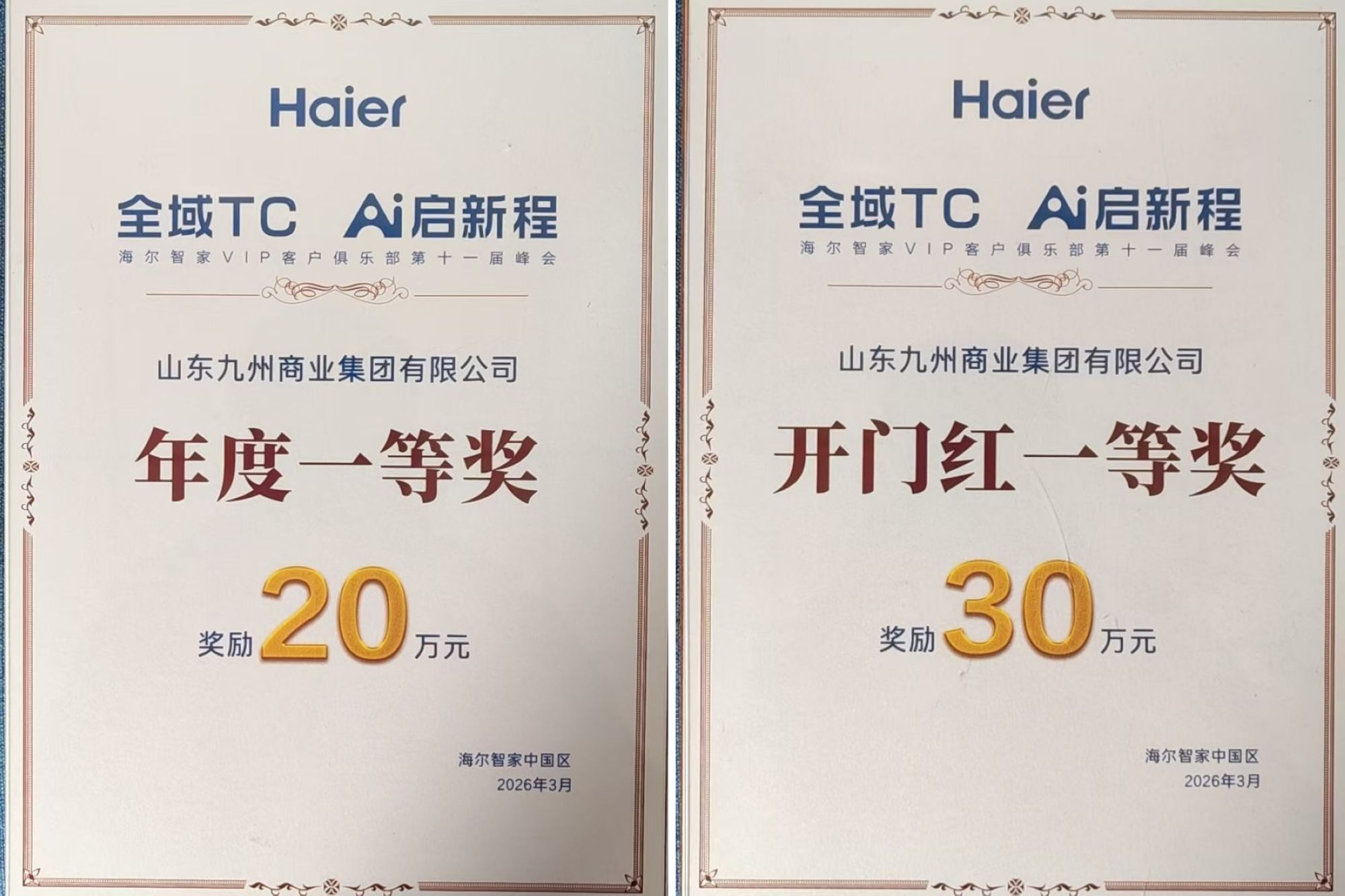 3月12日至15日,“全域TC AI啟新程”海爾智家VIP客戶俱樂部第十一屆峰會(huì)在上海召開。會(huì)上,九州家電憑借經(jīng)營(yíng)團(tuán)隊(duì)的突出表現(xiàn),榮獲兩項(xiàng)獎(jiǎng)項(xiàng):2025年度海爾智家VIP俱樂部C組一等獎(jiǎng)(獎(jiǎng)勵(lì)20萬元)、2026年度海爾智家VIP俱樂部開門紅一等獎(jiǎng)(獎(jiǎng)勵(lì)30萬元)。