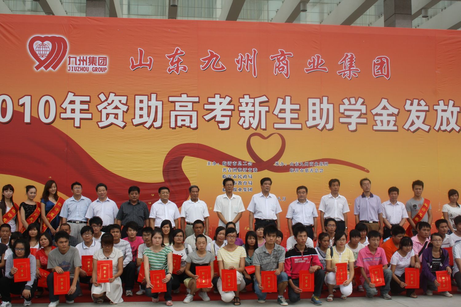 8月31日上午,山東九州商業(yè)集團(tuán)2010年資助高考新生助學(xué)金發(fā)放儀式在臨沂賓館商城店舉行。儀式上,66名品學(xué)兼優(yōu)的特困新生每人獲得了4000元的助學(xué)金。市人大常委會(huì)副主任、市慈善總會(huì)名譽(yù)會(huì)長(zhǎng)李寶智,市政府副秘書長(zhǎng)、市慈善總會(huì)副會(huì)長(zhǎng)張凡春,市紀(jì)委派駐五組書記王言卓,市民政局副局長(zhǎng)、市慈善總會(huì)副會(huì)長(zhǎng)朱步君,市總工會(huì)副主席陳愛(ài)平,共青團(tuán)臨沂市委副書記俞陽(yáng),市慈善總會(huì)副會(huì)長(zhǎng)、原集團(tuán)董事長(zhǎng)楊本渠,集團(tuán)董事長(zhǎng)楊沂城,集團(tuán)黨委書記王佐文,市慈善總會(huì)辦公室主任李長(zhǎng)征,市教育局學(xué)生資助中心主任陳磊等出席發(fā)放儀式。 這是集團(tuán)連續(xù)三年向高考特困新生發(fā)放助學(xué)金。三年來(lái),集團(tuán)幫助近百名高考新生順利走進(jìn)了大學(xué)校門,在學(xué)校里許多受資助的學(xué)生紛紛來(lái)信表達(dá)感激之情。集團(tuán)積極投身慈善事業(yè),勇于承擔(dān)社會(huì)責(zé)任,得到了上級(jí)領(lǐng)導(dǎo)和社會(huì)各界的一致好評(píng),被授予“臨沂市十大愛(ài)心企業(yè)”、“臨沂市首屆十大慈善單位”等榮譽(yù)稱號(hào)。