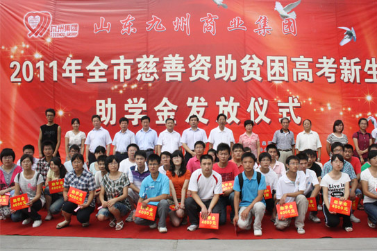8月12日,2011年度山東九州商業(yè)集團(tuán)資助貧困高考新生助學(xué)金發(fā)放儀式在臨沂賓館大學(xué)酒店舉行。50名在今年高考中取得優(yōu)異成績的貧困新生每人領(lǐng)到了4000元九州慈善助學(xué)金。市委常委、市總工會主席林祥余、市政協(xié)副主席趙愛華、市人大常委會法工委主任殷洪舉、市民政局局長姜新利、市紀(jì)委派駐五組副書記王培成、市慈善總會副會長楊本渠、集團(tuán)董事長楊沂城、集團(tuán)黨委書記王佐文等出席儀式。