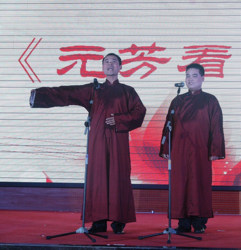 晚會在舞蹈《花開盛世中國美》中拉開帷幕。歌伴舞《祝福祖國》、《紅紅的日子》唱出了九州兒女對祖國的無限熱愛。舞蹈《青花瓷》清新的舞姿、《歡聚一堂》熱烈的場面,讓觀眾如癡如醉,贏得了陣陣掌聲。小品《愛在九州》,是我集團員工熱情服務(wù)的真實寫照;而《回家過年》,我們又仿佛從中找到了自己的影子。舞蹈《姑娘我愛你》,一群小伙子用優(yōu)美的舞姿演繹了別樣的柔情;《為九州喝彩》則展現(xiàn)出了九州姑娘們的青春活力。詩朗誦《感恩與成長》、《九州,我用青春的名義為你歌唱》,分別表達了員工對企業(yè)的熱愛,與企業(yè)一起成長的強烈愿望。舞蹈《蒸蒸日上》在最后時刻打出的橫幅“和諧九州  蒸蒸日上”,道出了全體員工共同的心聲。相聲《元芳看九州》,結(jié)合當(dāng)前網(wǎng)絡(luò)流行語,細數(shù)九州一年來取得的輝煌成績;曲藝說唱《喜唱九州春滿園》,形式新穎,用說唱的形式描述企業(yè)五十年走過的不平凡之路。音樂劇《你幸福嗎?》,寓教于樂,道出了幸福的真諦:以創(chuàng)造為樂,以工作為榮;《假如你要認識我》、《南泥灣》、《珊瑚頌》《九九艷陽天》……,一首首熟悉的老歌,仿佛讓我們回到了那個激情燃燒的歲月!敦S收的碩果》,用曼妙的舞姿,歌頌勞動,歌頌收獲。影子舞《九州跟黨走》,形式新穎,寓意美好,將整場晚會推向了高潮。